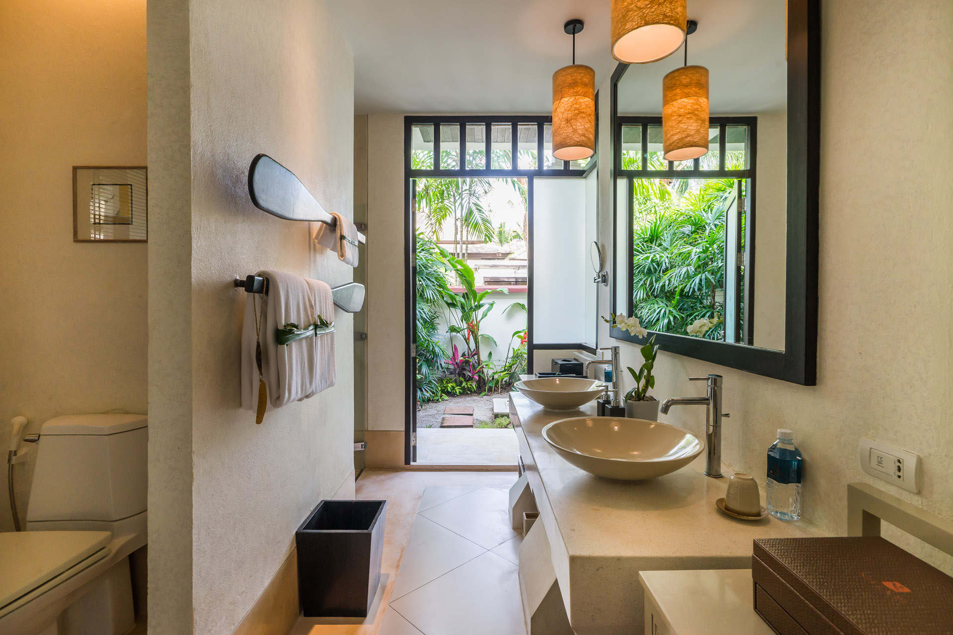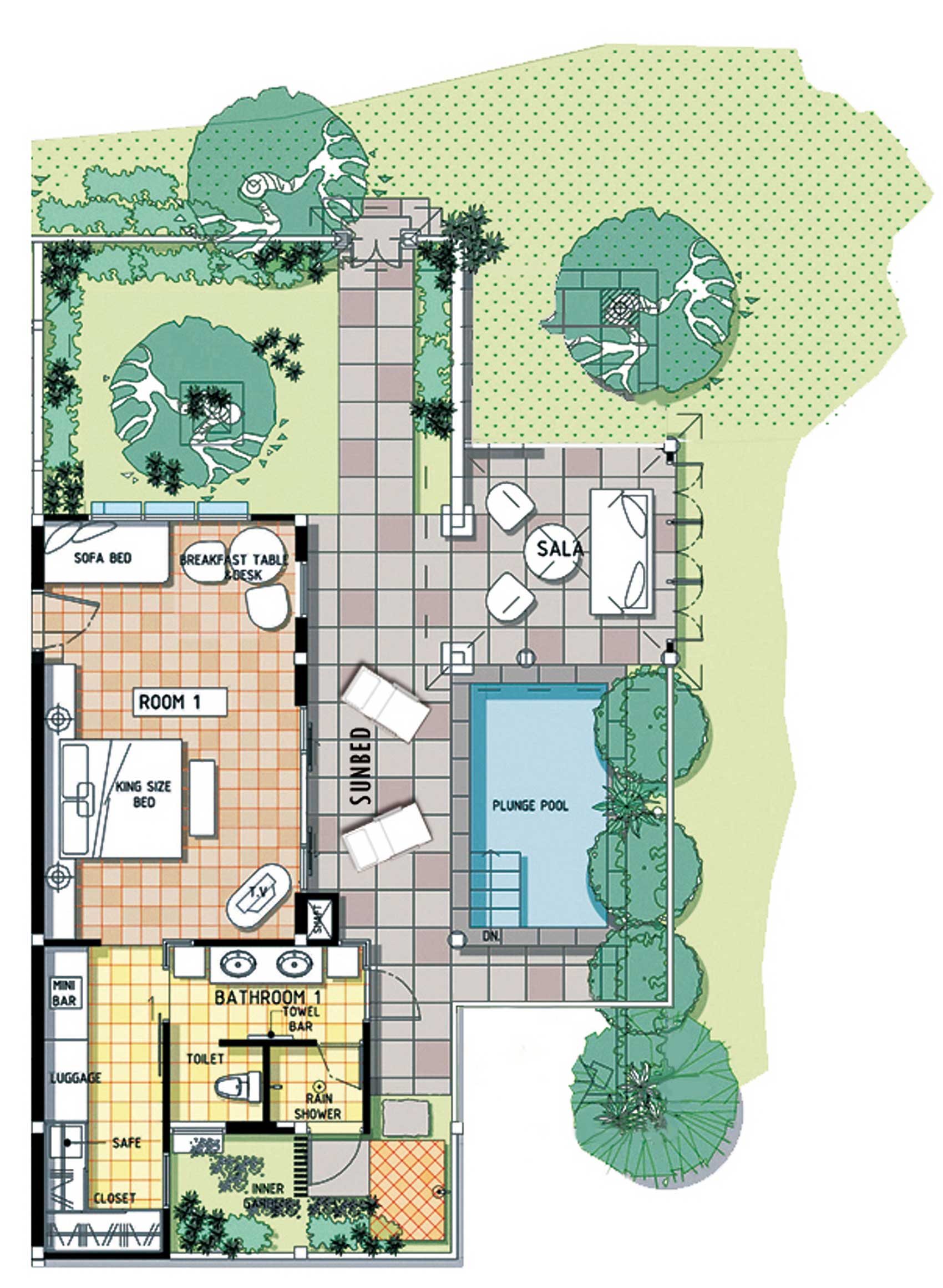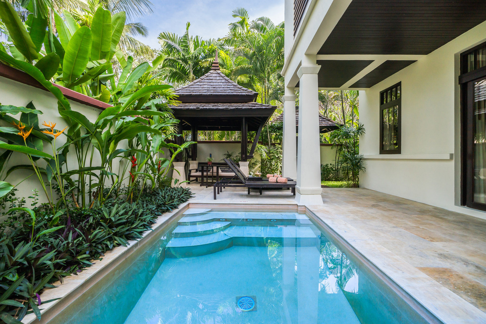 Each room is set on a single ground-floor level with direct access to a tropical courtyard complete with a Sala and a private plunge pool on the terrace, surrounded by lush gardens. Guests can enjoy seamless flow between the indoor and outdoor living spaces, with entry points from both the bedroom and lounge area. The expansive bathroom features twin basins, a large indoor shower, and an additional outdoor shower. This room offers outstanding value for those seeking the indulgence of a Samui private pool room.